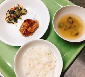 鶏肉のソテーと、お野菜の和え物、味噌汁、ご飯。